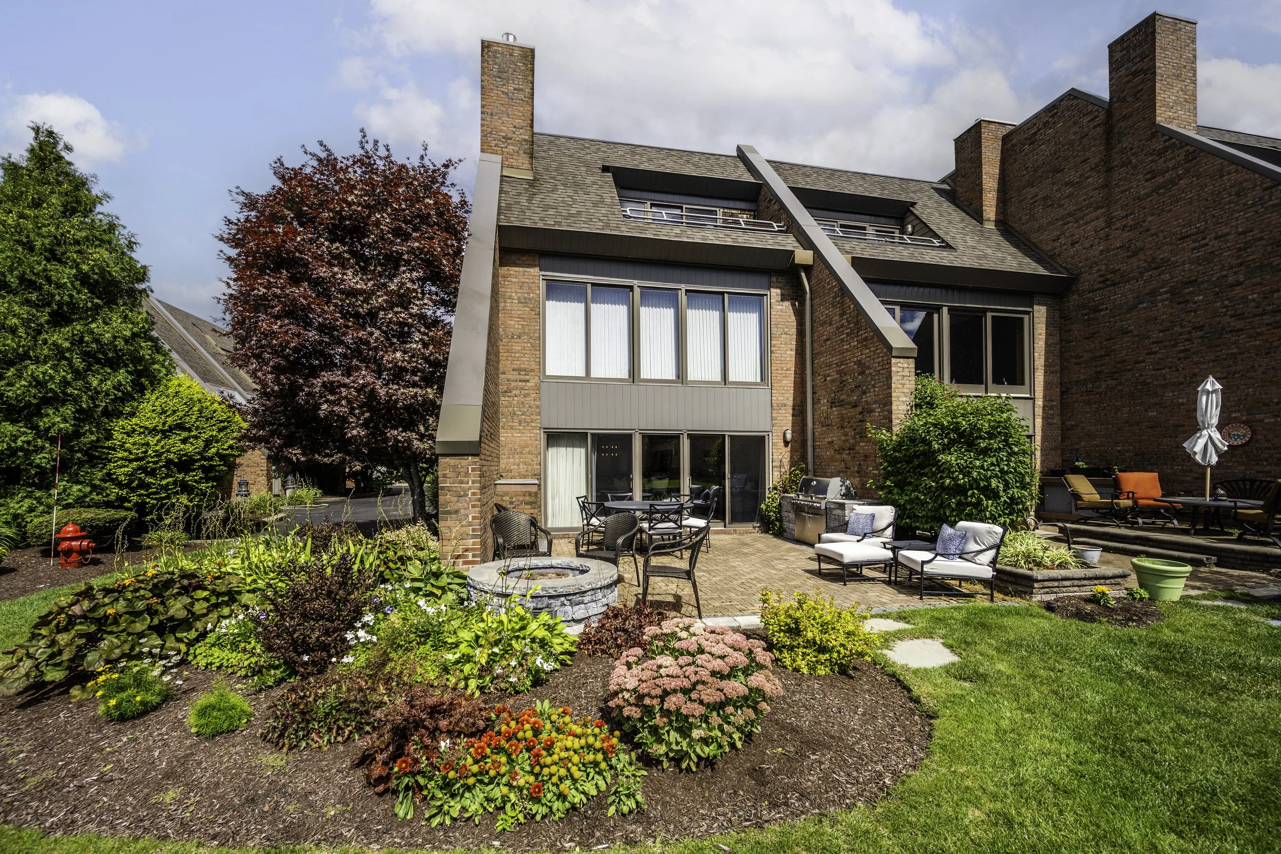 As you walk outside through the sliding glass doors in the living area you step out on to a beautiful patio with plenty of space for grilling and hosting. The property is right up against a beautiful water feature and fountain, with Erie Basin Marina and Lake Erie just steps away.