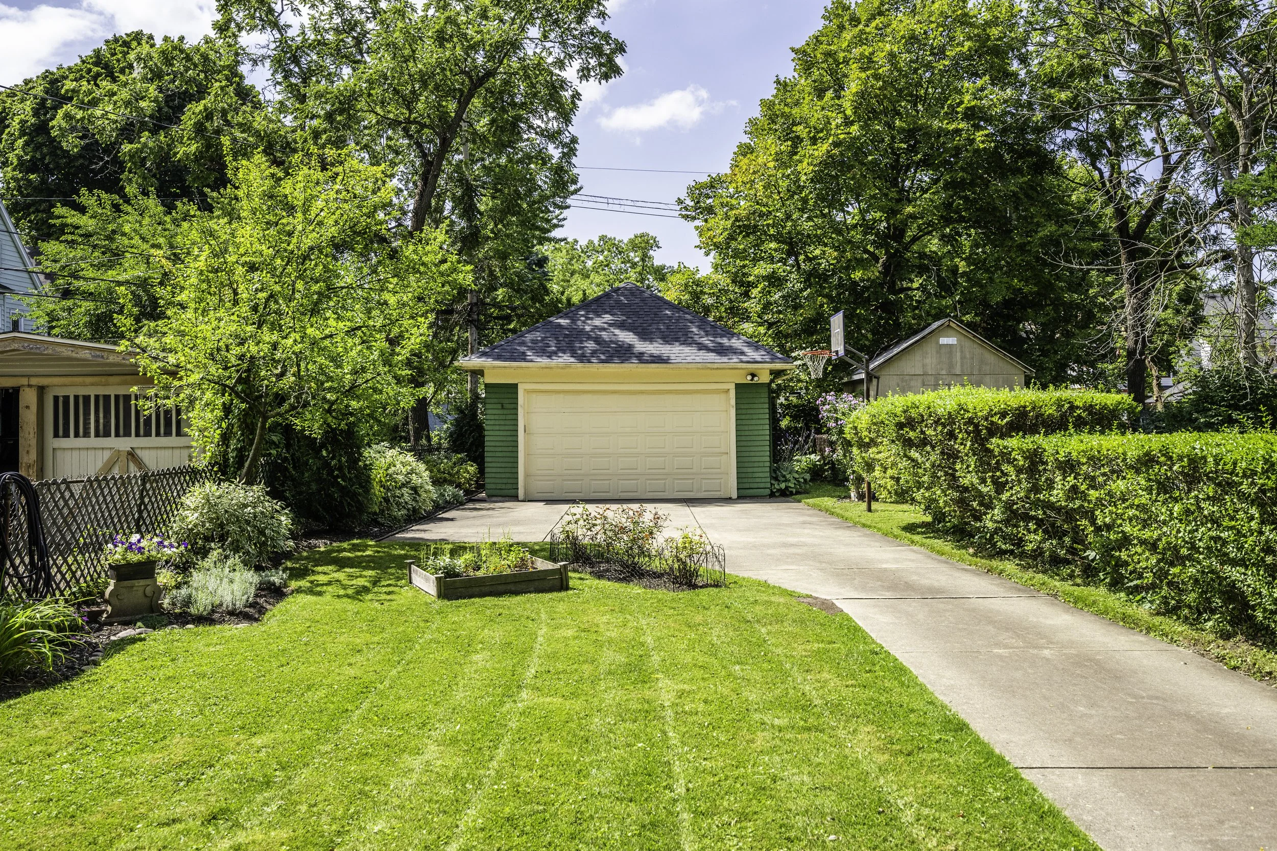 The backyard is quite large and has a shaded and well maintained porch which is just off of the kitchen. There’s a large garage in the very back of the yard and a beautiful garden that’s been tastefully curated.